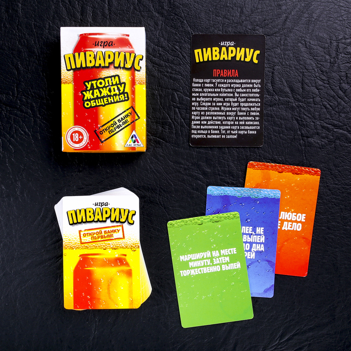 Разложите колоду карт вокруг банки пива. Затем каждый игрок по очереди вытягивает карточку с заданием. После выполнения игрок засовывает карточку под кольцо в банке. Тот, чья карта открыла банку, ее выпивает. Как видите, все очень просто!